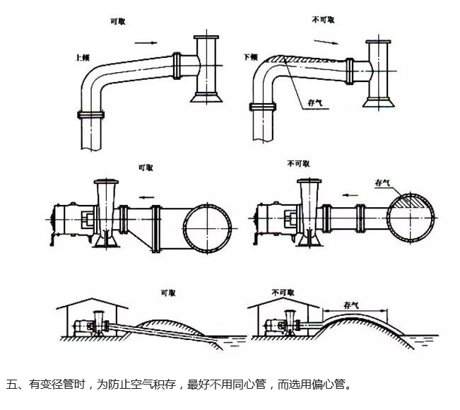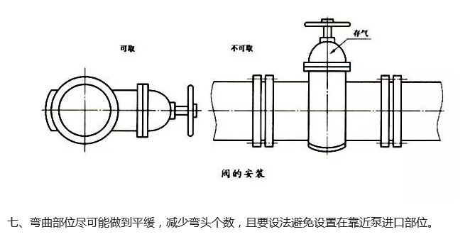 四、吸入管路的布置,一定要設法使得從吸入面到泵具有有向上的坡度(1/50左右)以使管路中不存空氣,如圖7-3。但是管道淹沒在水下時,從吸水管到泵取向下的坡度。
