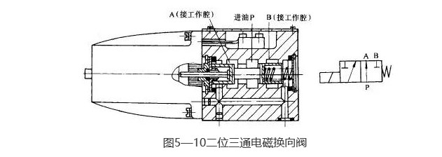 圖5—10為二位三通板式交流電磁換向閥的結構和圖形符號圖。當電磁鐵通電時,即推動推桿將閥芯頂向右端;又當電磁鐵斷電時,閥芯在彈簧的作用下回到左端,從而實現了油路的換向。
