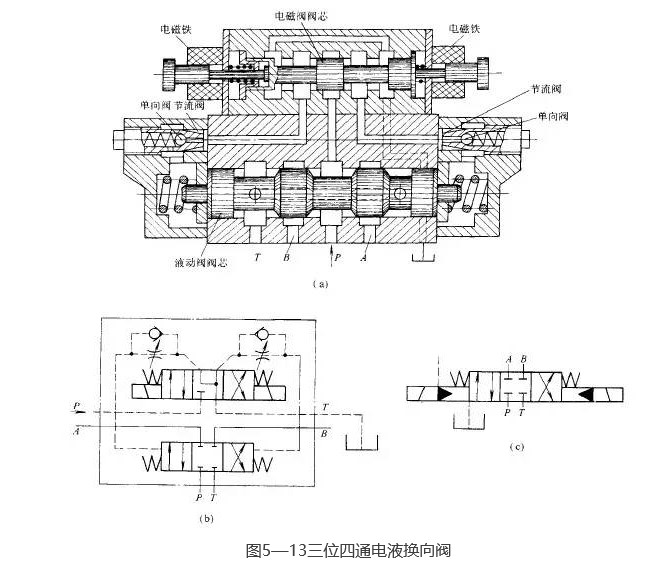 圖5-11所示為35D-25B型三位五通板式交流電磁換向閥的結構和圖形符號圖。當左、右電磁鐵均斷電時,其閥芯在兩端彈簧的作用下處于中位(圖示位置);當左電磁鐵通電時,即推動推桿將閥芯頂向右端;當右電磁鐵通電時,即推動推桿將閥芯頂向左端,從而實現了油路的換向。