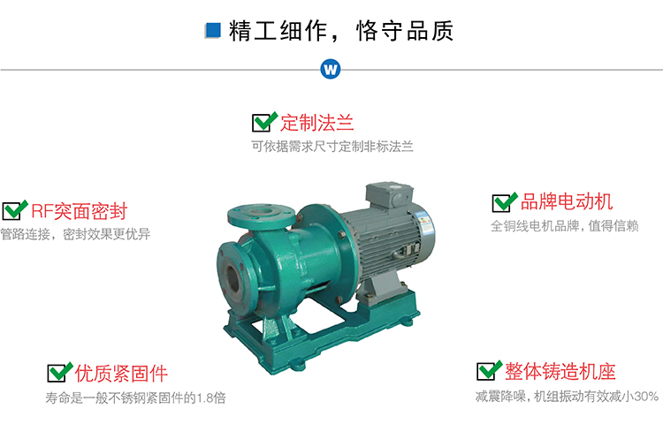 氟塑料磁力泵又稱其為氟塑料磁力離心泵、襯四氟磁力泵、氟塑料磁力驅動泵、耐腐蝕磁力化工泵,CQB-FJ襯氟磁力泵是我公司氟塑料磁力泵中的全新升級款型,產品性能好,運轉更加穩定,材質更好,全封閉無泄露,適合現代化的環保要求。