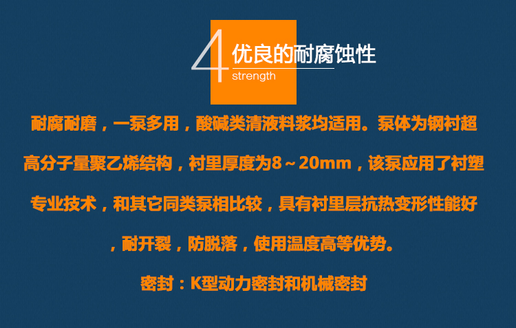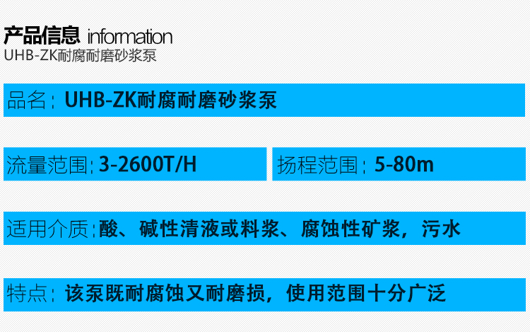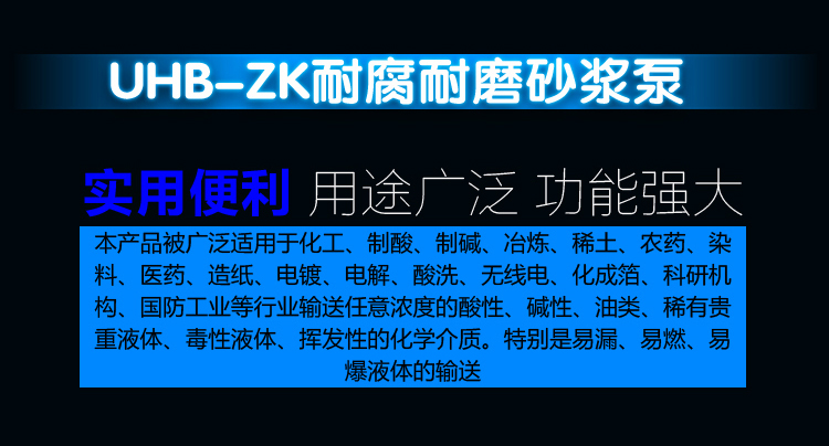 UHB-ZK耐腐耐磨砂漿泵能適應各種不同的工況。如:既可以傳送酸、堿類清液或料漿,也可以輸送冶煉行業各種腐蝕性礦漿,還可以輸送硫酸行業各類稀酸、環保行業的各類污水等。可輸送濃度80%以下的硫酸、50%以下的硝酸、鹽酸等積各類酸、堿、鹽的料漿,稀有金屬冶煉行業的各種腐蝕性砂漿及食品,酒類行業中的各類混合型介質。該泵既耐腐蝕又耐磨損,使用范圍十分廣泛。